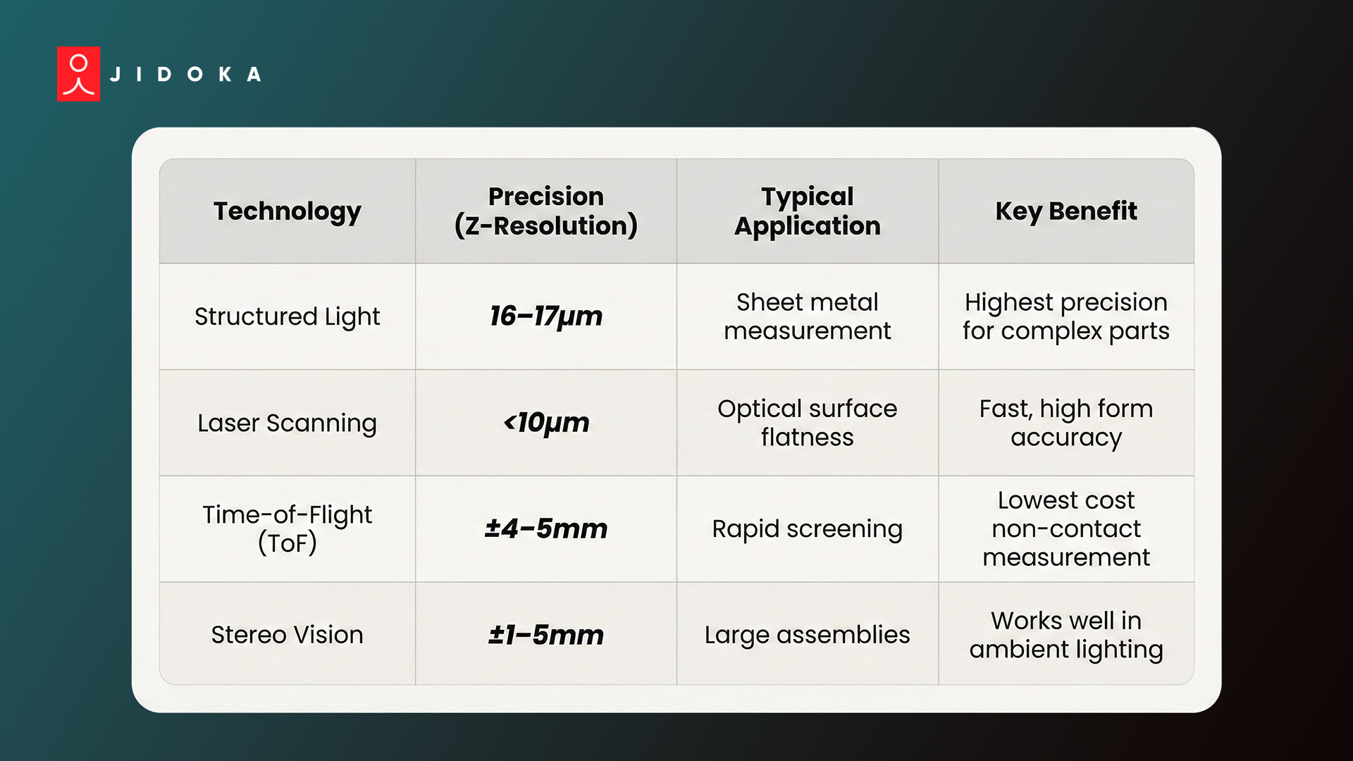 Structured light projects patterns to capture surface shapes. Using flatness measurement with this method provides 16-17µm accuracy. It is the best flatness inspection technology for complex sheet metal measurement. Jidoka Technologies uses these sensors to ensure high form accuracy on busy lines.