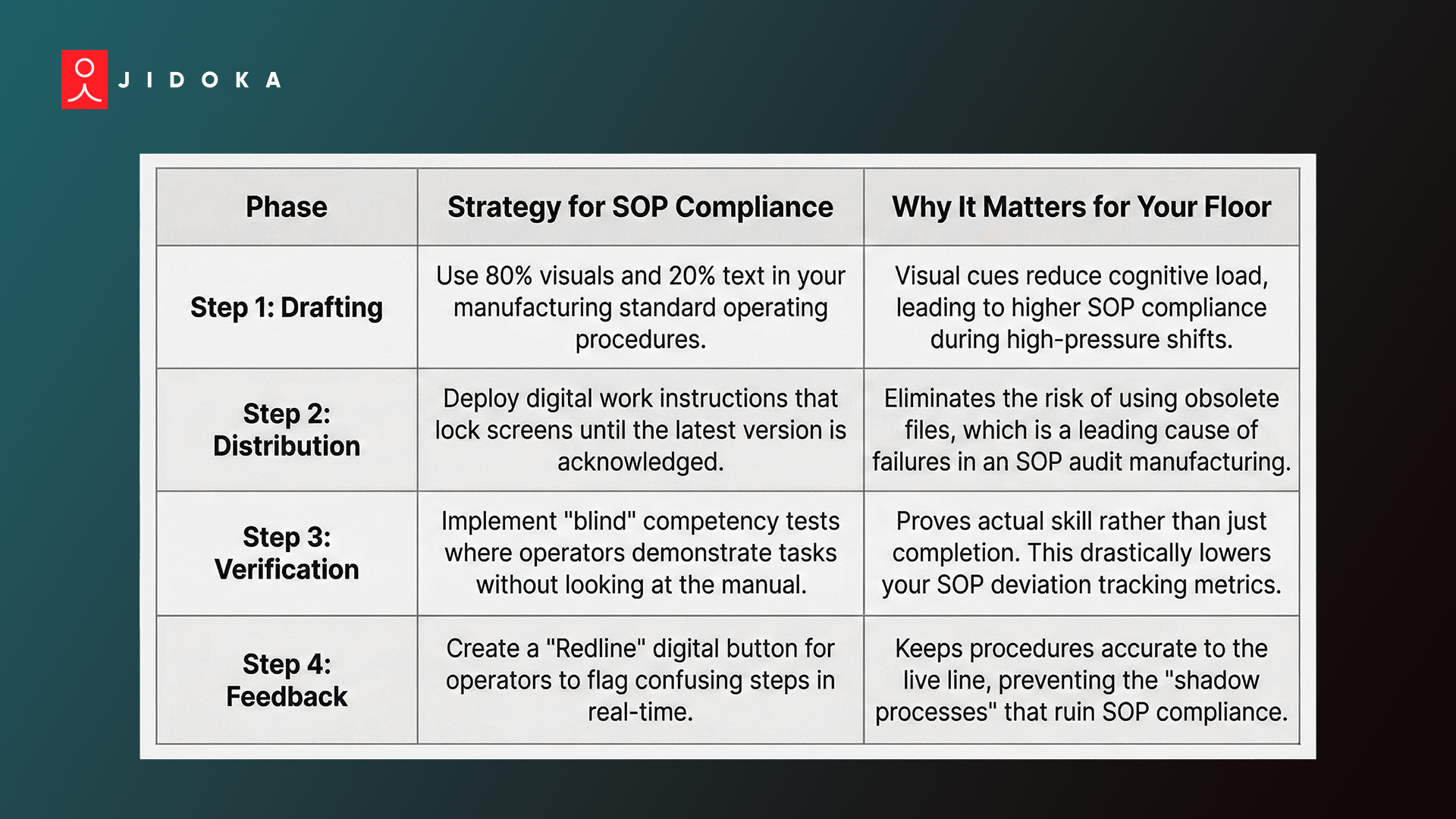 Creating SOP compliance in manufacturing requires more than just writing rules. You must build a system that people can actually use. Follow these steps to improve SOP compliance across your entire facility.