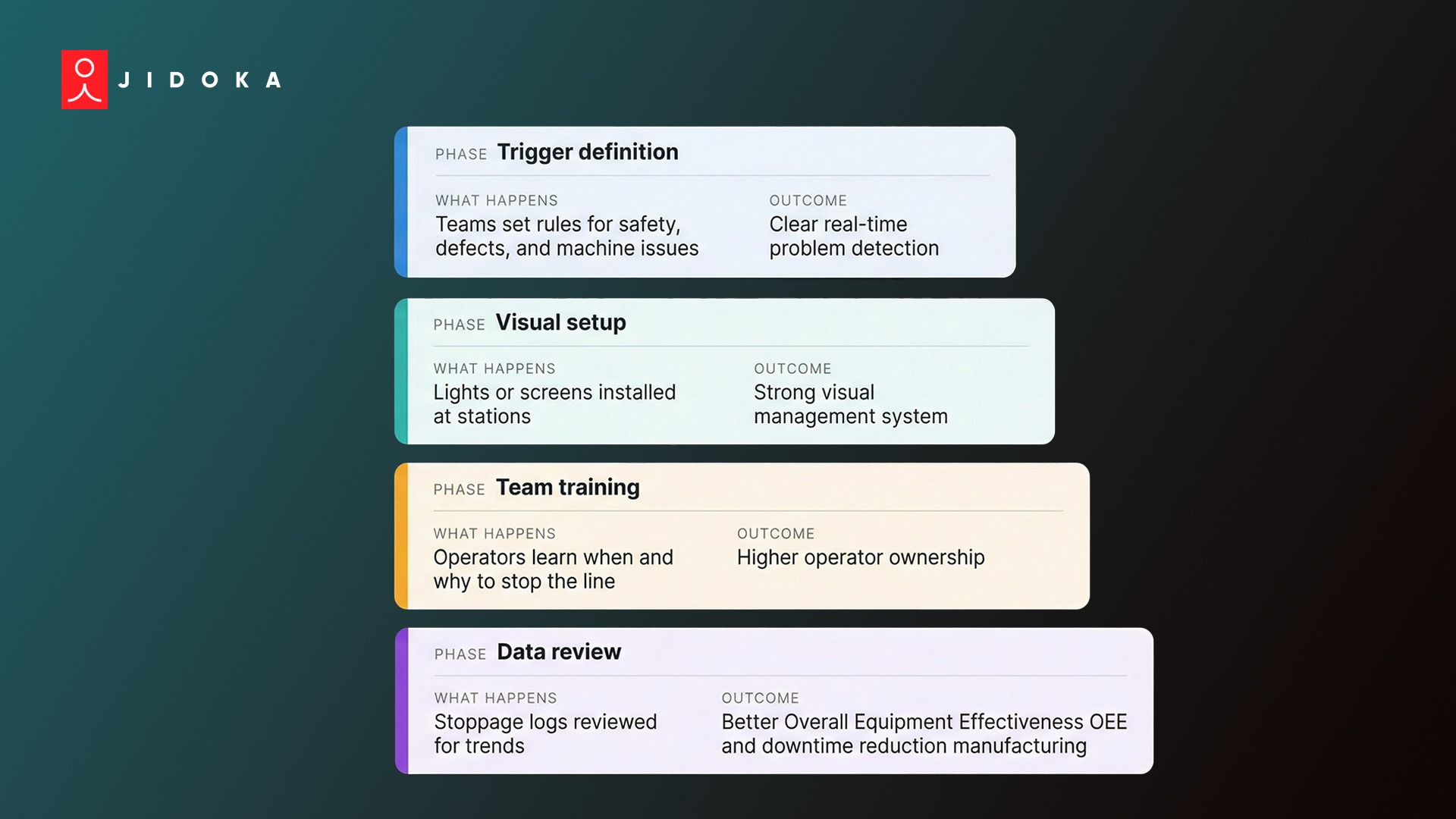 Jidoka Tech strengthens this model by automating detection through vision systems and connected alerts. Instead of waiting for human reaction, issues trigger signals instantly.