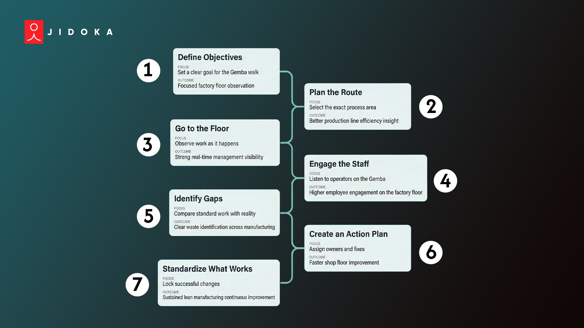 A Gemba walk only works when leaders treat it as a disciplined practice, not a routine visit. Each step builds clarity through direct factory floor observation and structured follow-through.