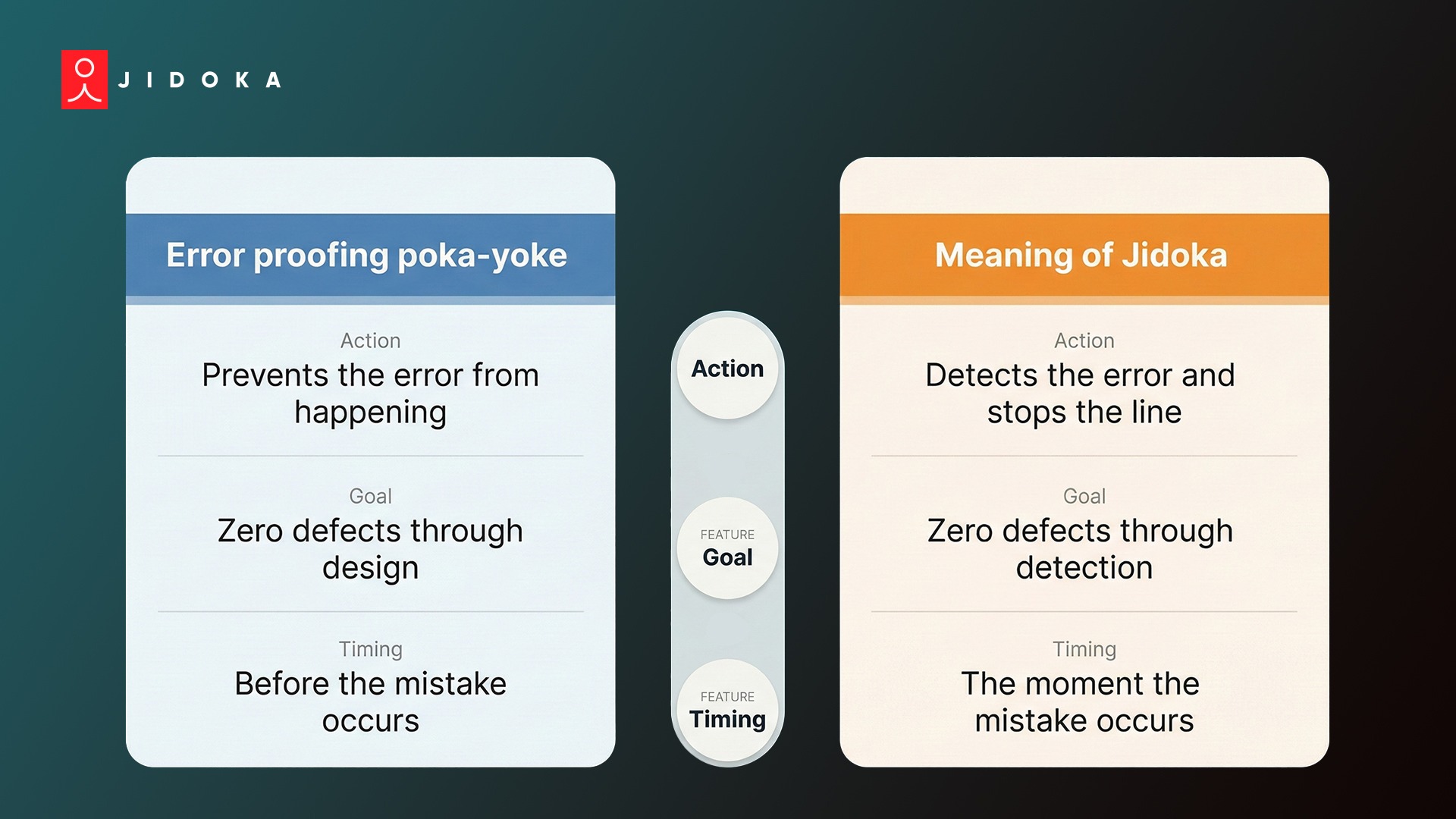 Error-proofing, or poka-yoke, prevents a mistake from starting. The meaning of Jidoka involves defect detection systems that stop the line if an error occurs. Both tools drive manufacturing excellence. One stops the cause, while the other stops the result through quality control automation.