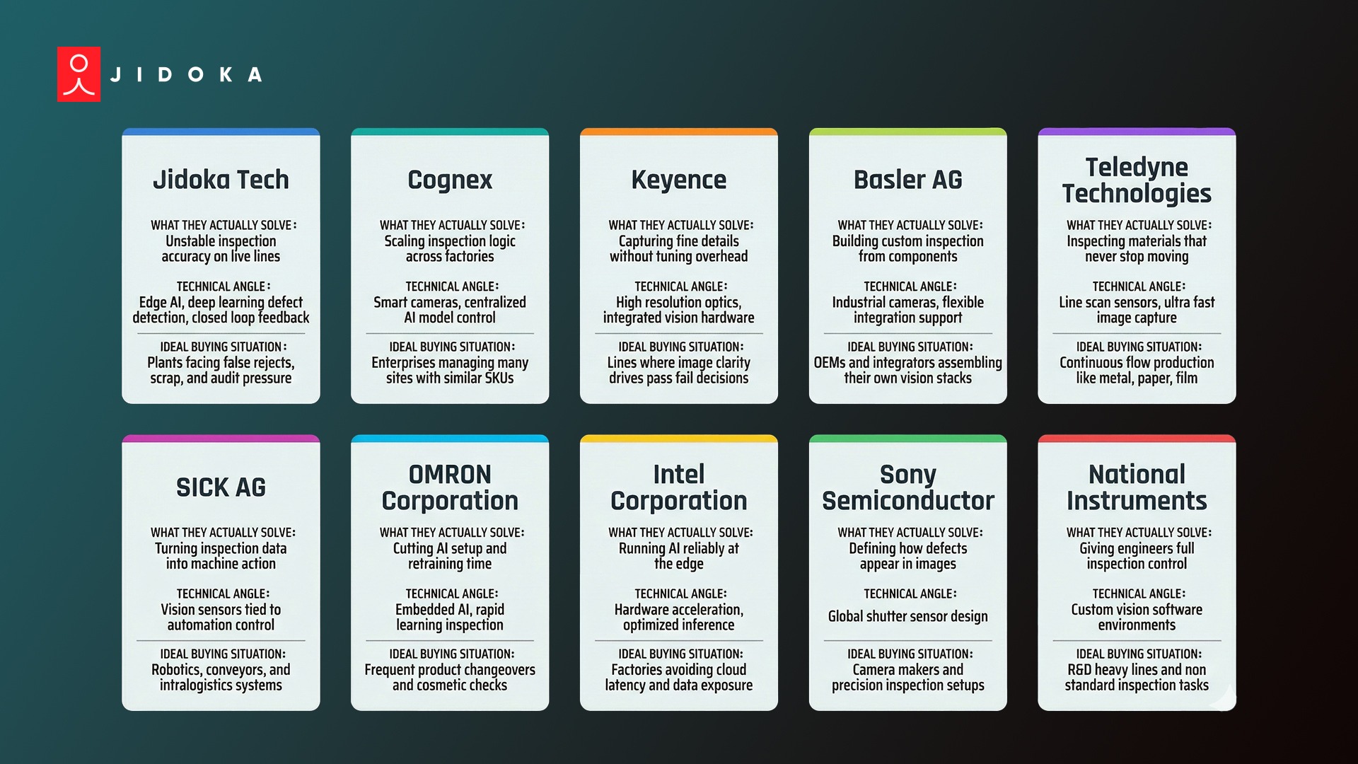 Jidoka stands apart from top machine vision companies by delivering a full machine vision inspection system, not isolated tools. It combines AI visual inspection software, edge computing vision, automated visual inspection, and production line integration to reduce false rejects and stabilize real-time quality control.